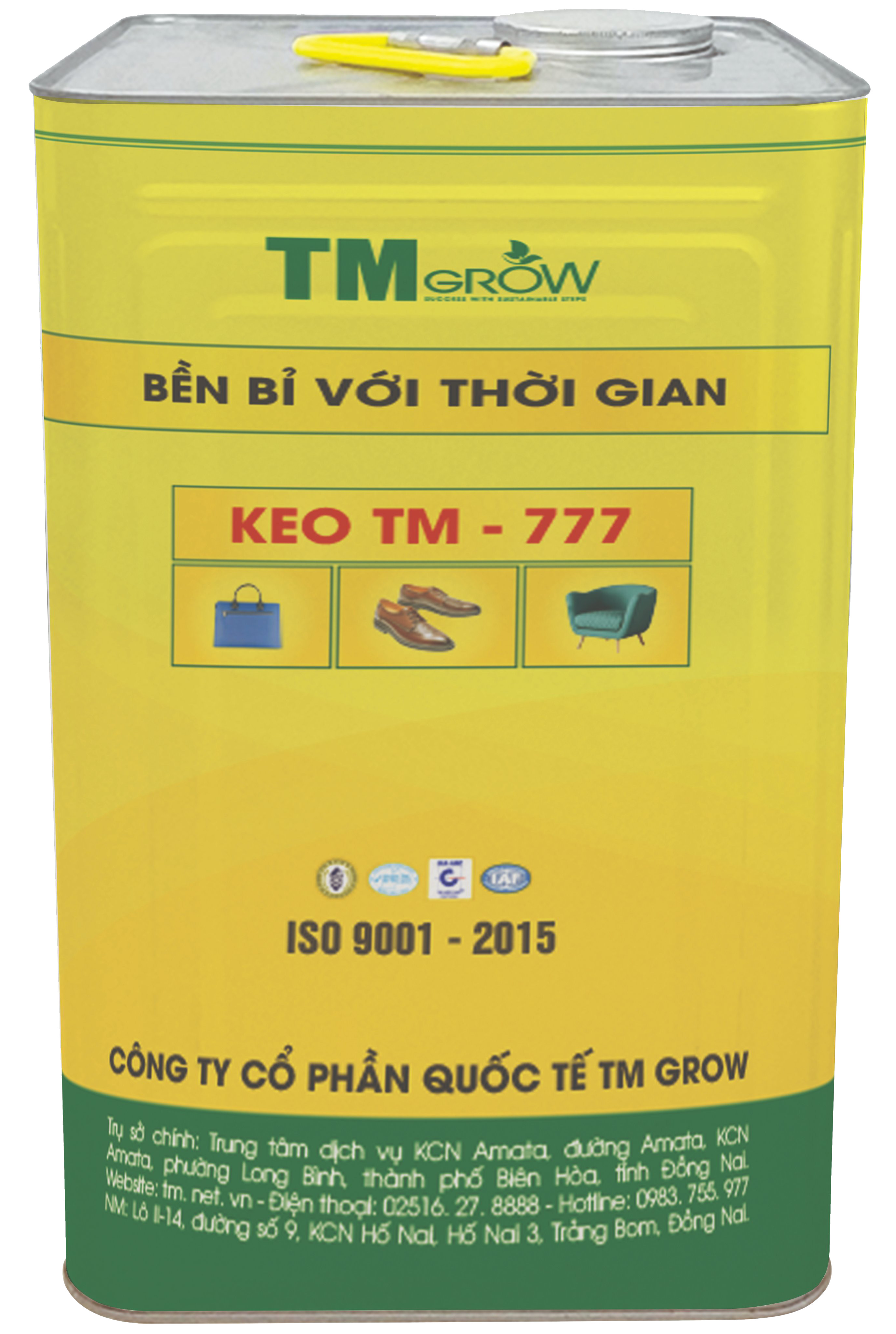Keo dán giày TM-777, thùng đóng gói trọng lượng 15kg. Keo chuyên dùng trong ngành giày - dép, để dán các chất liệu như PVC, PU, cao su, da thuộc, EVA, TPR, vải sợi nilong,…