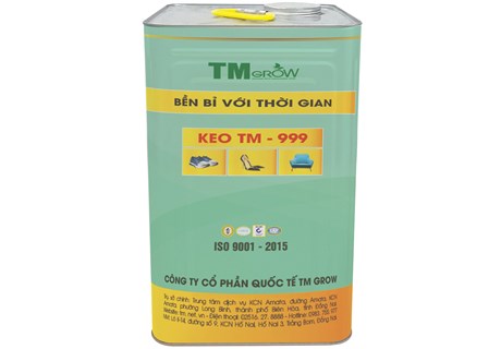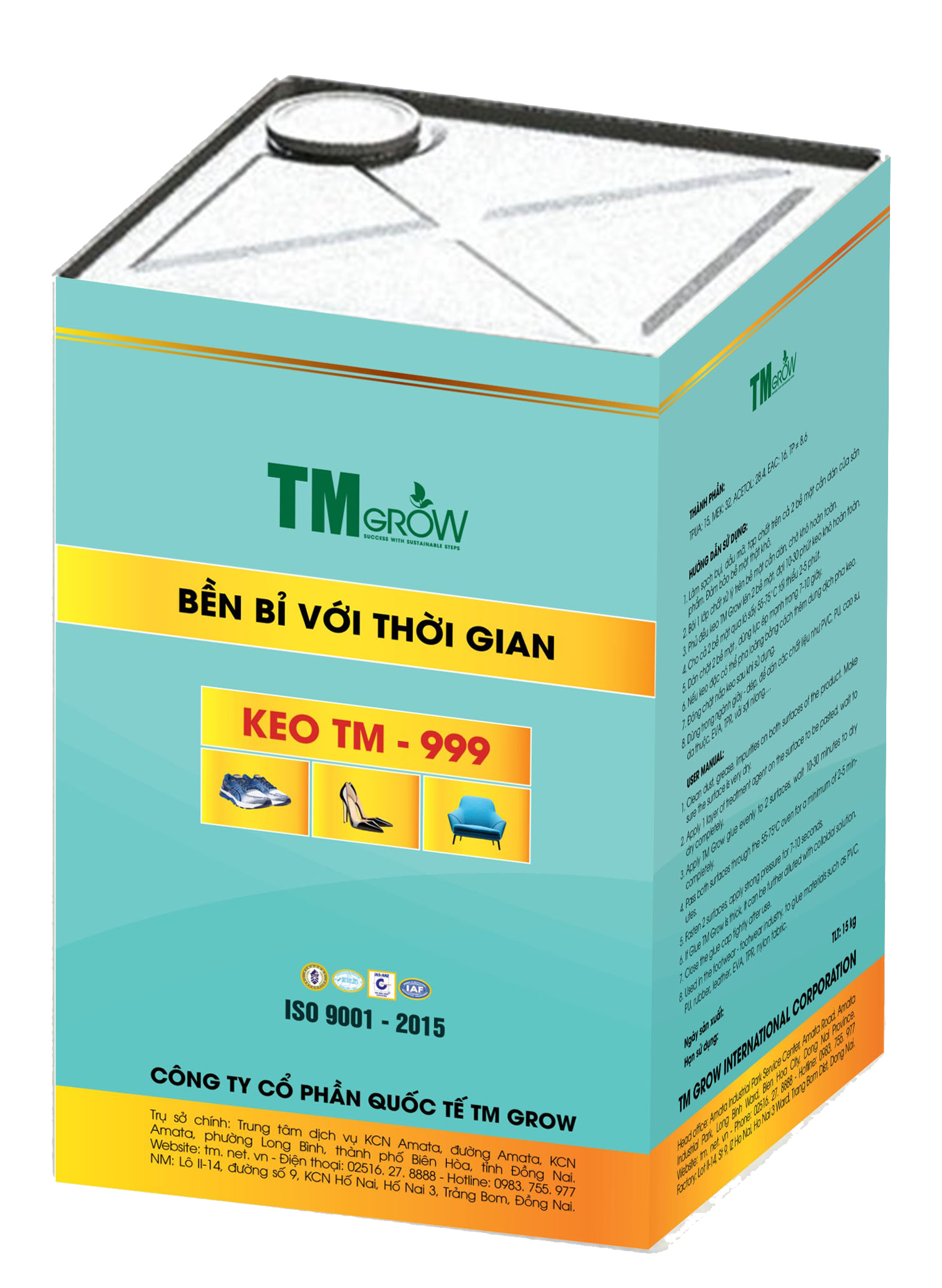 Keo dán giày TM-999, thùng đóng gói trọng lượng 15kg. Keo chuyên dùng trong ngành giày - dép, để dán các chất liệu như PVC, PU, cao su, da thuộc, EVA, TPR, vải sợi nilong,…