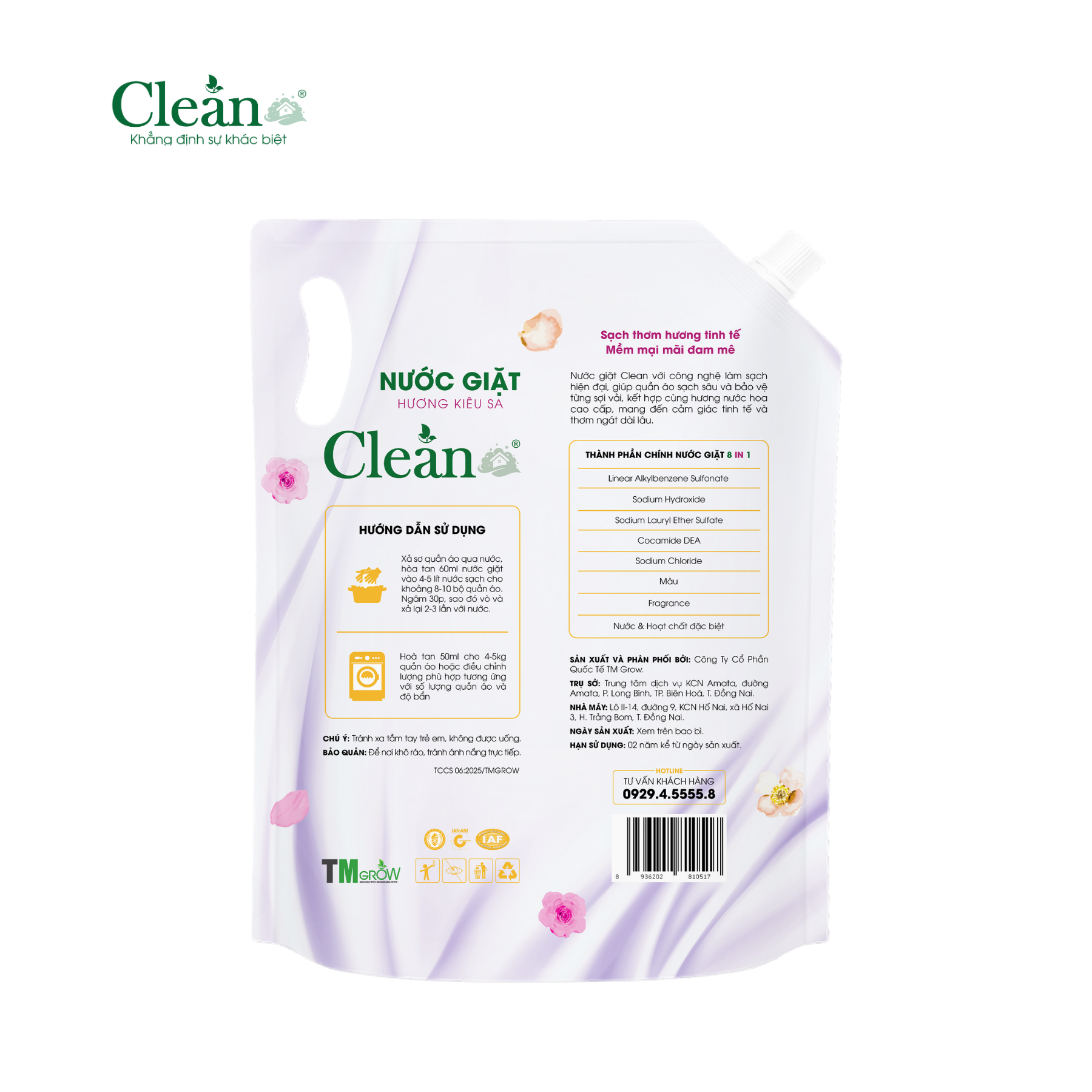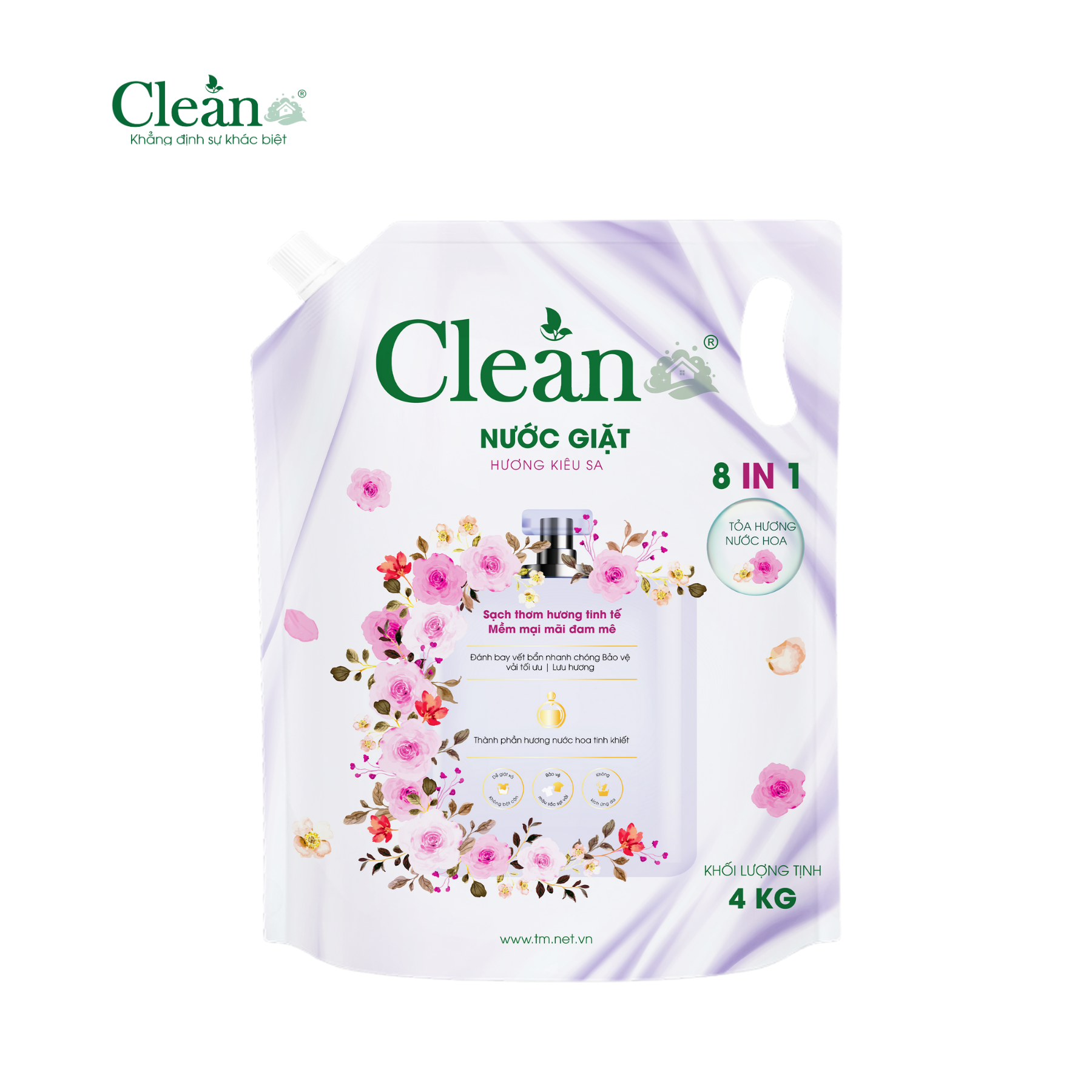 Nước giặt Clean, nơi hương nước hoa tinh khiết hòa quyện cùng công nghệ làm sạch hiện đại, mang đến sự tinh tế cho từng sợi vải, giúp quần áo mềm mại và lưu giữ hương thơm quyến rũ bền lâu. |